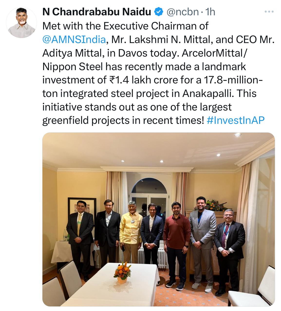 దావోస్లో మిట్టల్ గ్రూప్ ఎగ్జిక్యూటివ్ ఛైర్మన్ లక్ష్మీ మిట్టల్, సీఈఓ ఆదిత్య మిట్టల్తో సమావేశమైన ముఖ్యమంత్రి నారా చంద్రబాబు నాయుడు గారు, మంత్రులు నారా లోకేష్ గారు, టీజీ భరత్ గారు. ఆర్సెలర్ మిట్టల్, నిప్పాన్ స్టీల్ సంయుక్తంగా 17.8 మిలియన్ టన్నుల కెపాసిటీతో గ్రీన్ ఫీల్డ్ స్టీల్ ప్లాంట్ను ఏపీలో ఏర్పాటు చేయడానికి ఇప్పటికే అంగీకారం తెలిపారు. ఈ ప్రాజెక్టు ముందుకు తీసుకెళ్లే అంశంపై ముఖ్యమంత్రి బృందం చర్చలు జరిపింది.
