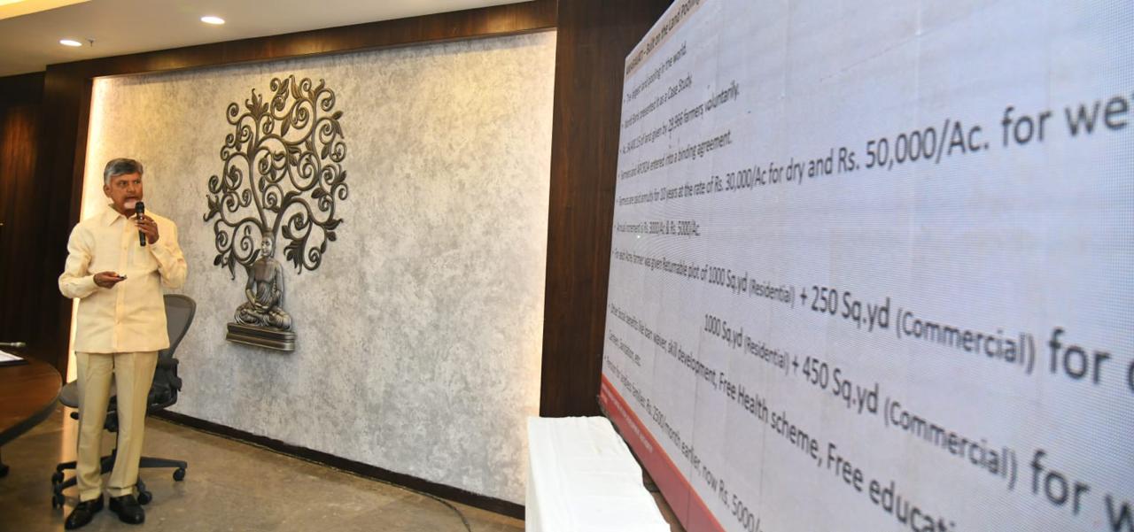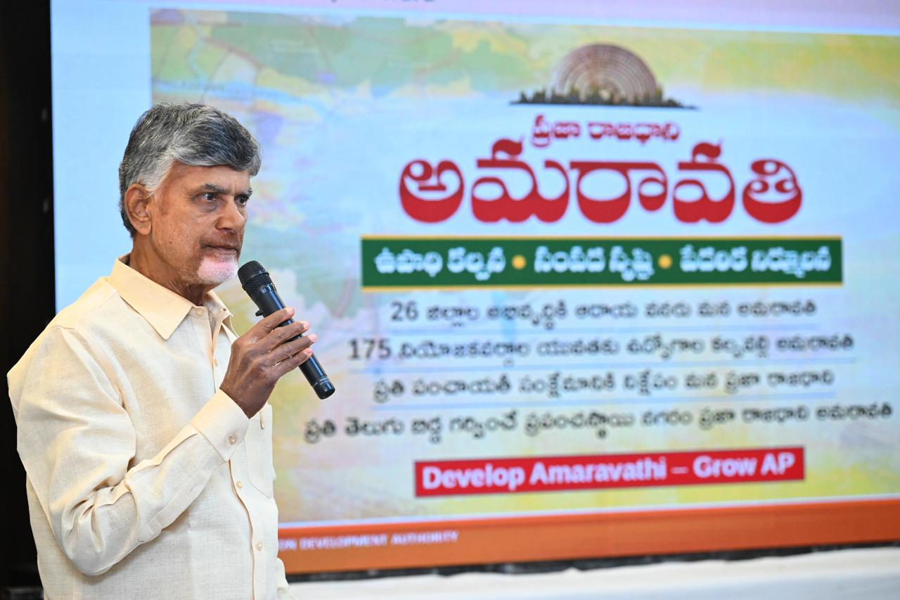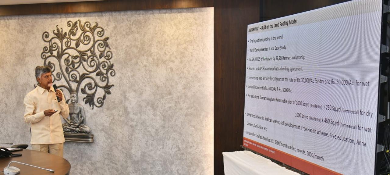 ‘‘రోడ్లు, ఇతర నిర్మాణాలకు 27,885, రిటర్నబుల్ ప్లాట్ల కింద 11,826, ఇతర అవసరాలకు 14,037 ఎకరాలు పోను ప్రభుత్వం వద్ద 8,274 ఎకరాలు ఉంటుంది. ప్రభుత్వం వద్దనున్న భూమిని విక్రయించి కూడా రాజధాని నిర్మాణం చేయొచ్చని ఆలోచించాం. కేంద్ర ప్రభుత్వం కేపిటెల్ గెయిన్ మినహాయింపు ఇచ్చింది. రూ.2,500 కోట్లు ఇవ్వడానికి కేంద్రం ఒప్పుకుని రూ.1500 కోట్లు కూడా అందించింది. రాష్ట్రం నడిమద్యలో రాజధాని ఉండాలని నాడు అసెంబ్లీలో జగన్ అన్నారు. నేను ఇల్లు కట్టుకున్నా…మీరు కట్టుకోలేదు అని నన్ను అన్నారు. కానీ తర్వాత ఏం నిర్ణయాలు తీసుకుని ఎలా మాటలు మార్చారో అంతా చూశాం. రాజధాని నిర్మాణానికి ప్రపంచ బ్యాంకుతో పాటు ఏఐఐబీ, జెఐసీఏ వంటి సంస్థలు ఆర్థిక తోడ్పాటుకు ముందుకు వచ్చాయి. సింగపూర్ తో ఎంఓయూ కుదుర్చుకున్నాం. మొదట సీఆర్డీయే మాస్టర్ ప్లాన్, తర్వాత రాజధాని మాస్టర్ ప్లాన్ ను సింగపూర్ అందించింది. నవ నగరాలకు రూపకల్పన చేసి మాస్టర్ ప్లాన్ అందించారు. దేశంలోనే స్మార్ట్ సిటీగా, ప్రపంచ స్థాయి నగరంగా ఆర్థిక రాజధానిగా అమరావతి విజన్ రూపొందించాం. పరిశ్రమలతో పాటు ఉద్యోగాల కల్పన కేంద్రంగా నిర్ణయించాం. నాలెడ్జ్ ఎకానమీకి చిరునామాగా ఉండాలని రూపొందించాం. అసెంబ్లీ, హైకోర్టు, సెక్రటేరియట్ తో పాటు అన్ని విభాగాలు ఒక చోట ఉండాలని మాస్టర్ ప్లాన్ లో నిర్ణయించాం. ఇందులో పచ్చదనానికి అధిక ప్రాధాన్యం ఇచ్చాం. ఏ సిటీకి కి.మీ మేర నదుల అవకాశం లేదు…కానీ అమరావతికి ఉంది. రెండు నదులను అనుసంధానం చేసే కాన్సెప్ట్ తో రూపకల్పన చేశాం. రూ.51,687 కోట్లతో రాజధానులకు అంచనా వేసి రూ.41,170 కోట్లకు టెండర్లు పిలిచాం. అప్పటికి జరిగిన నిర్మాణాలకు గాను రూ.4,318 కోట్లు బిల్లులు చెల్లించాం…రూ.1,268 కోట్లు ఇప్పటికీ పెండింగులో ఉన్నాయి.’’ అని సీఎం చంద్రబాబు వివరించారు.