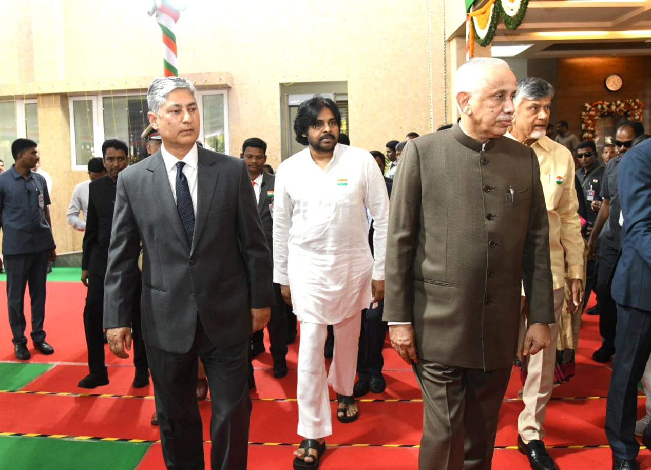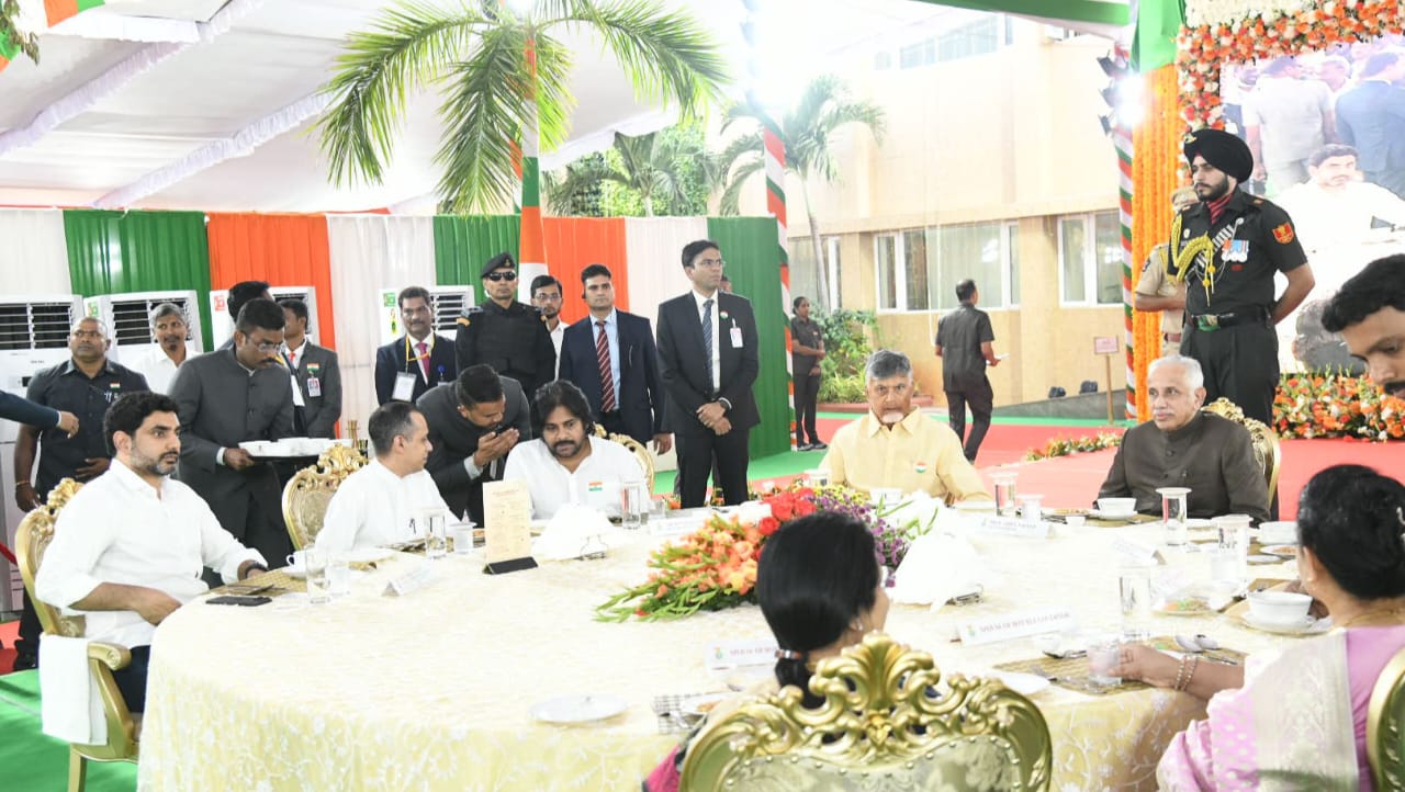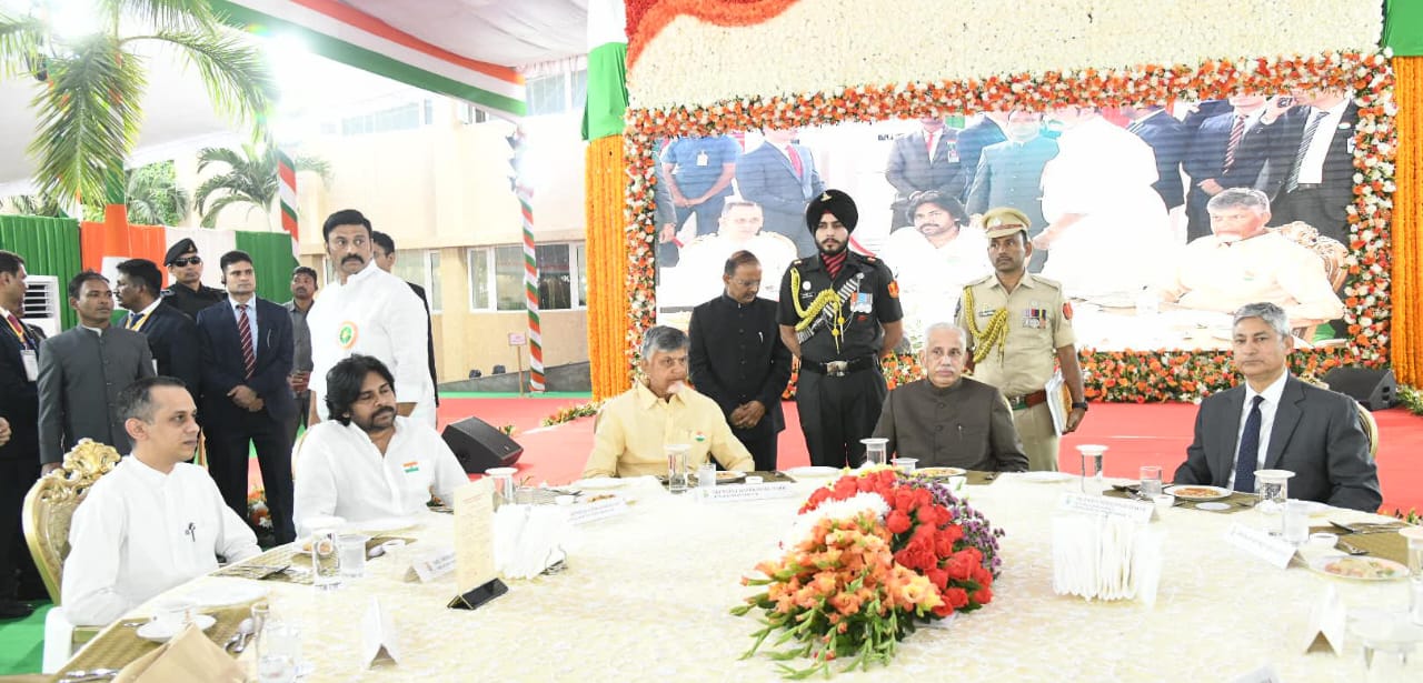 76 వ గణతంత్ర దినోత్సవం సందర్బంగా విజయవాడ లోని గవర్నర్ నివాసమైన రాజ్ భవన్ లో ఎట్ హోం కార్యక్రమం ఆదివారం సాయంత్రం నిర్వహించారు… ఎట్ హోం నిర్వహించడమనేది రిపబ్లిక్ డే రోజు ఆనవాయితీ గా వస్తుంది.. అందులో బాగంగా చేపట్టిన ఎట్ హోం కు సిఎం చంద్రబాబు నాయుడు తో పాటు డిప్యూటీ సిఎం పవన్ కల్యాణ్ ,మంత్రులు లోకేష్ , పయ్యావుల కేశవ్, అచ్చన్నాయుడు, సత్యకుమార్ యాదవ్, నారాయణ, నాదెండ్ల మనోహర్, పార్థసారథి, ఎస్. సవిత, హైకోర్టు ప్రధాన న్యాయమూర్తి ధీరజ్ సింగ్ ఠాకూర్, ఇతర న్యాయమూర్తులు, చీఫ్ సెక్రటరీ విజయానంద్, డిజిపి ద్వారకా తిరుమల రావు, డిప్యూటీ స్పీకర్ రఘురామకృష్ణం రాజు,ఎంఎల్ఏ లు యార్లగడ్డ వెంకటరావు,గద్దె రామ్మోహన్, శ్రీరామ్ తాతయ్య, మండలి బుద్ధ ప్రసాద్, వర్ల కుమార్ రాజా, వెనిగండ్ల రాము, ప్రజా ప్రతినిధులు, సీనియర్ ఐఏఎస్ , ఐపిఎస్ అధికారులు, సిపిఐ రామకృష్ణ, వివిధ పార్టీల ముఖ్య నేతలు ,ఇతర ప్రముఖులు పాల్గొన్నారు… ఈ సందర్బంగా ఒకరి కొకరు ఆత్మీయంగా పలుకరించుకుంటూ గవర్నర్ ఏర్పాటు చేసిన ఆతిద్యాన్ని స్వీకరించారు..