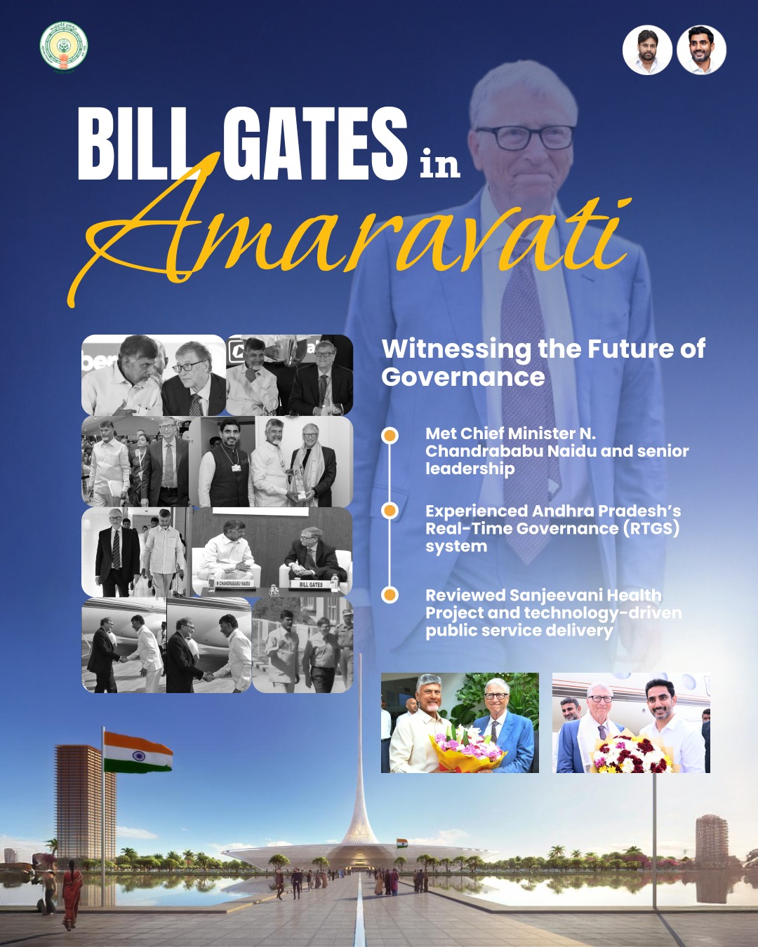 Bill Gates also enquired about the implementation of Sanjeevani health project being implemented in Kuppam constituency with the support of Gates Foundation. When Chief Minister Chandrababu Naidu said that the state government maintaining health record of all people using AI, Bill Gates appreciated the efforts of Chief Minister and opined that diagnostic services should be made available for poor at low price. Bill Gates also enquired about the Amaravati capital development, for which the Chief Minister said that Amaravati will be developed as green and blue city.
