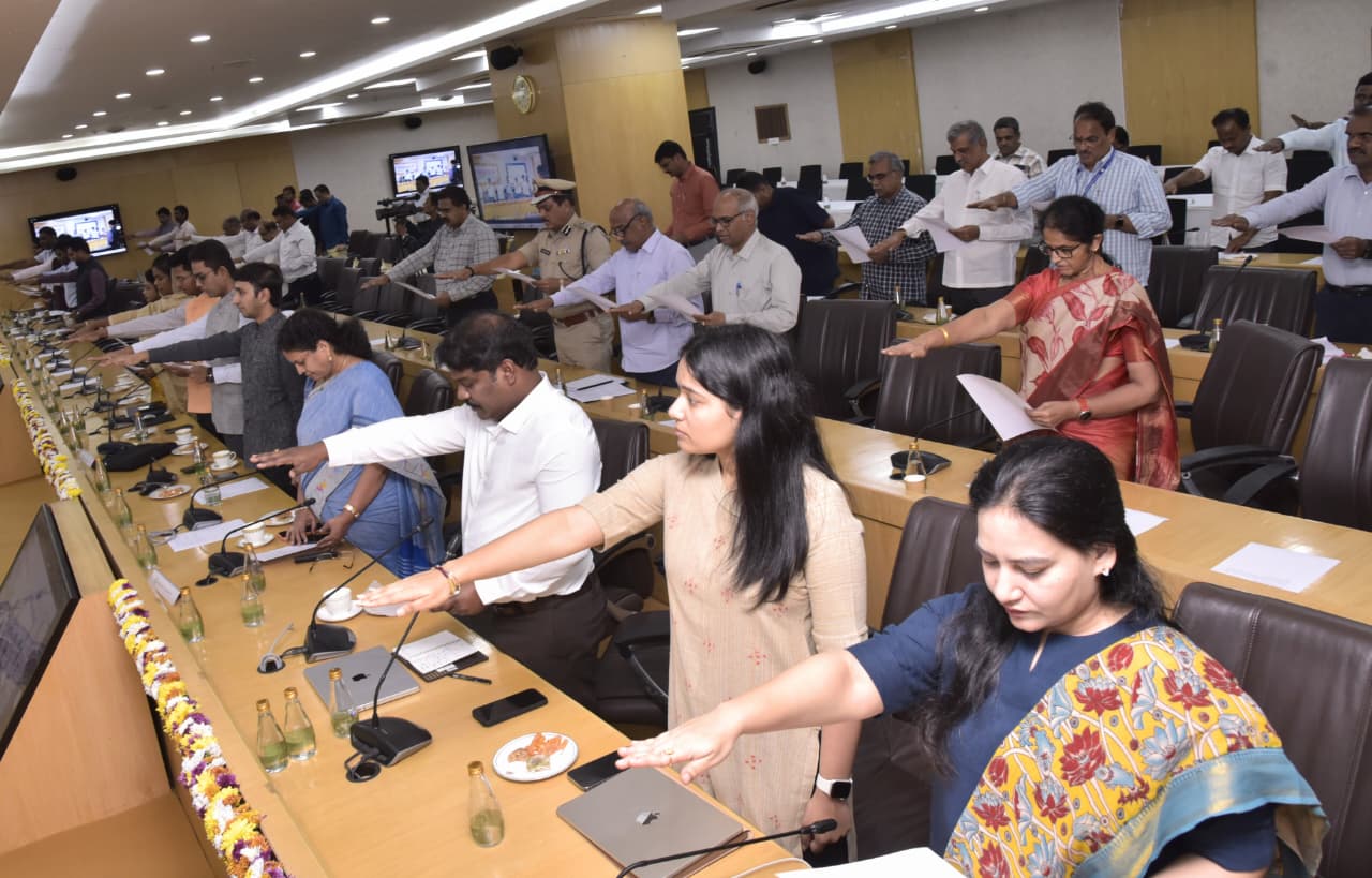 అనంతరం సిఎస్ సాయి ప్రసాద్ కార్యక్రమంలో పాల్గొన్నఅందరితో వికసిత్ భారత్, స్వర్ణాంధ్ర 2047 లక్ష్య సాధనలో భాగంగా దేశ సమగ్రత, స్వేచ్ఛను కాపాడుతానని, ప్రభుత్వం అమలు చేస్తున్న అభివృద్ధి సంక్షేమ పధకాల ఫలాలు చిట్ట చివరి వ్యక్తి వరకూ సక్రమంగా అందేలా పారదర్శకంగా,నిష్పక్షపాతంగా చిత్త శుద్ధి అంకిత భావంతో పని చేస్తానని సివిల్ సర్వీసెస్ రీడిడికేషన్ ప్రతిజ్ణ చేయించారు.