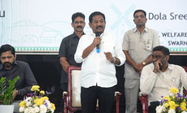 స్థానిక తుమ్మలపల్లి కళా క్షేత్రంలో శుక్రవారం జిల్లా, మండల, స్వర్ణ గ్రామ/స్వర్ణ వార్డు అధికారులకు, అర్బన్ స్వర్ణ వార్డు అధికారులకు రెండు రోజుల అవగాహన కార్యక్రమానికి రాష్ట్ర సాంఘిక సంక్షేమ, వికలాంగుల, సీనియర్ సిటిజన్ల సంక్షేమ, స్వర్ణ గ్రామ/స్వర్ణ వార్డు శాఖ మంత్రి డాక్టర్ డోలా శ్రీ బాల వీరాంజనేయ స్వామి ముఖ్యఅతిథి గా హాజరయ్యారు. ఈ సందర్భంగా మంత్రి మంత్రి మాట్లాడుతూ.. స్వర్ణ గ్రామ, స్వర్ణ వార్డు, స్వర్ణ మండల, స్వర్ణ జిల్లాల ద్వారా ‘స్వర్ణాంధ్ర ప్రదేశ్’ సాధించడమే లక్ష్యమని అని అన్నారు. ముఖ్యమంత్రి నారా చంద్రబాబునాయుడు లక్ష్యం మేరకు ‘విజన్ 2047’లో భాగంగా ‘స్వర్ణాంధ్ర ప్రదేశ్’ను సాధించడమే లక్ష్యమన్నారు. జిల్లా, మండల స్థాయి అర్బన్ లెవల్ స్వర్ణ గ్రామ/స్వర్ణ వార్డు అధికారులందరులకు మంత్రి అభినందనలు తెలియజేశారు. ముఖ్యమంత్రి తీసుకున్న నిర్ణయం వల్ల గతంలో వేర్వేరు క్యాడర్లలో ఉన్న అధికారులందరికీ నేడు ఇప్పుడు పదోన్నతులు లభించాయని ఆయన పేర్కొన్నారు.