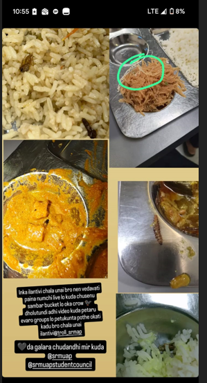 అమరావతి, ఏపీ : ఈ నెల నవంబర్ 3, 2025 న యస్ ఆర్ యం యూనివర్సిటీ అమరావతి హాస్టల్ లోని విద్యార్థులు కల్తీ ఆహరం తిని అస్వస్థకు గురయ్యారు. ఆదివారం ఇచ్చిన నాన్వెజ్ భోజనమే కారణమేమోనని వాపోతున్నారు. విద్యార్థులు ప్రశ్నించగా వారిని ప్రత్యేక గదులకు తీసుకెళ్లి వేరుగా చికిత్స అందించి గుమ్మనంగా సర్ది చెప్తున్నారన్నారు. ఒక విద్యార్థి కి గడువు ముగిసిన మందులు ఇవ్వడం అత్యంత బాధాకరమని చెప్తున్నారు. యూనివర్సిటీలోని DSC (ఇన్హౌస్ కమిటీ) సభ్యులు, హాస్టల్ విద్యార్థులు ఆహారం గురించి ప్రశ్నించగా –