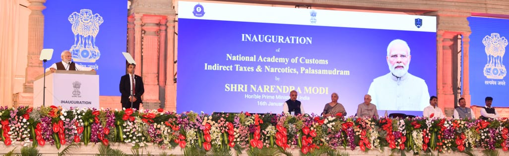 The Prime Minister, Shri Narendra Modi inaugurated the new campus of National Academy of Customs, Indirect Taxes & Narcotics at Palasamudram, Sri Sathya Sai District in Andhra Pradesh today. He also took a walkthrough of the exhibition showcased on the occasion. The Prime Minister also interacted with Officer Trainees of the 74th and 75th batches of the Indian Revenue Service (Custom & Indirect Taxes) as well as officer trainees of the Royal Civil Service of Bhutan.