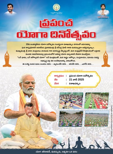 The Chief Minister noted the global recognition of International Yoga Day since its adoption by the United Nations. He credited Prime Minister Modi’s leadership in driving this impact, with Yoga Day now celebrated at over 12 lakh venues across 175+ countries and 10 crore participants worldwide. He thanked PM Modi for granting Andhra Pradesh the honor to host this historic event.