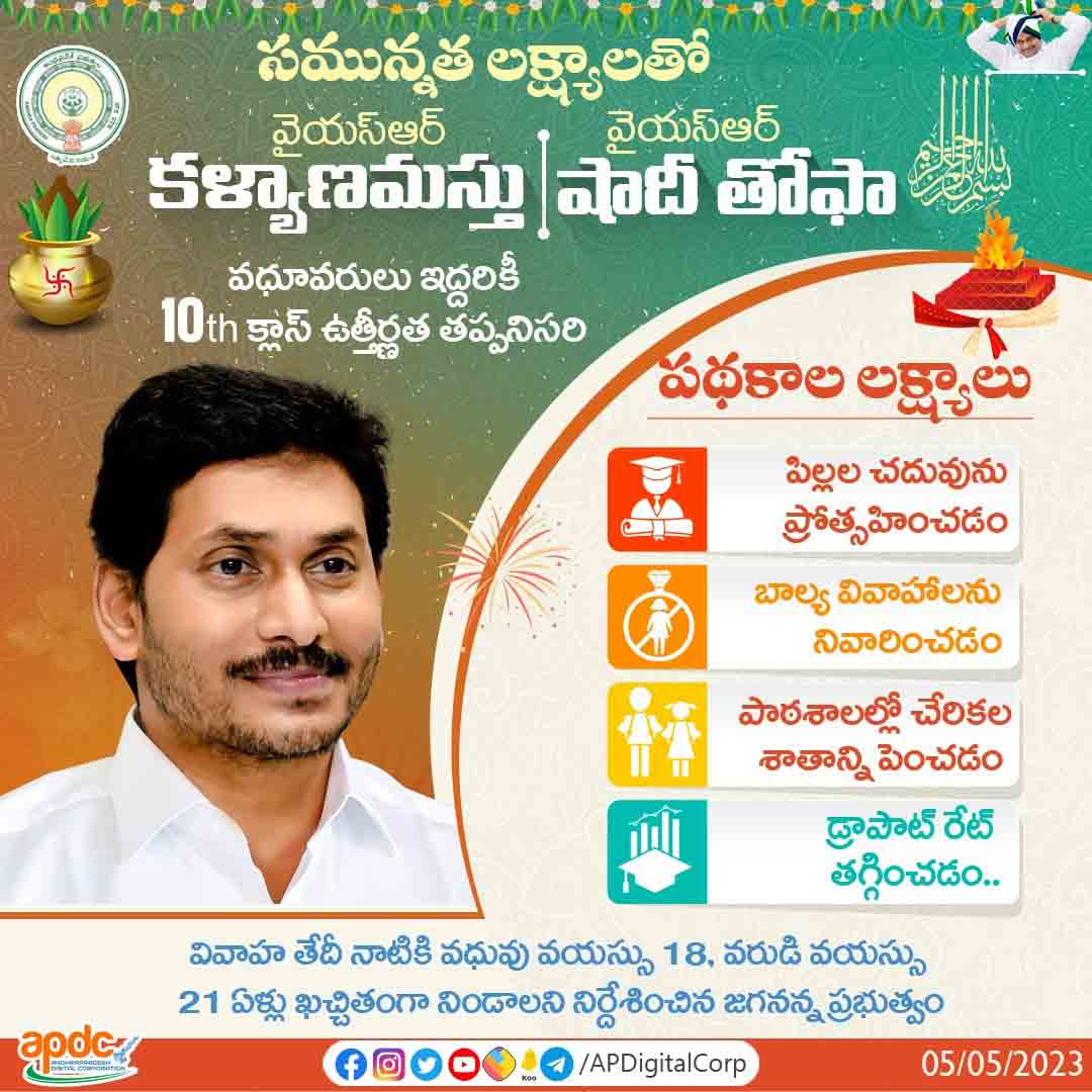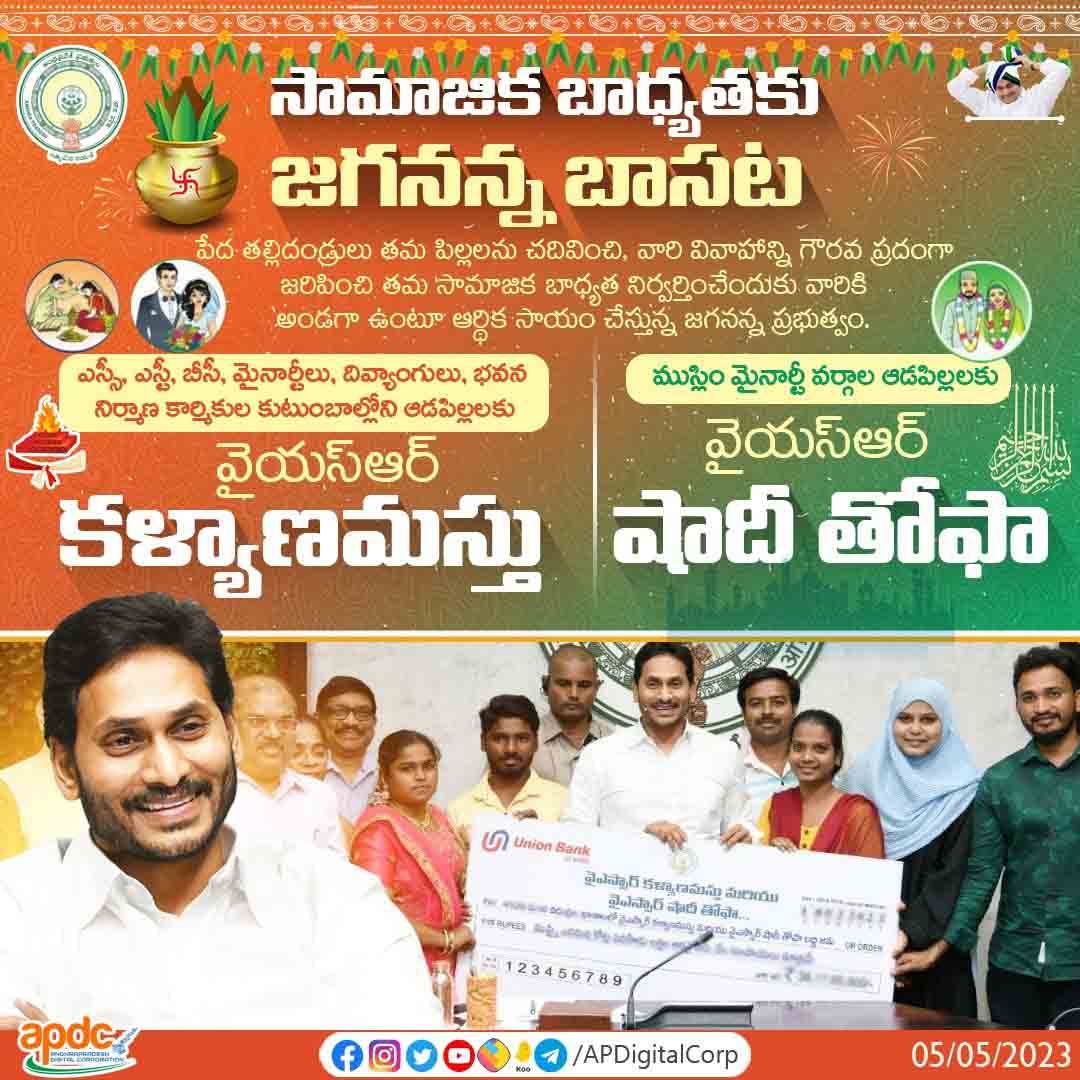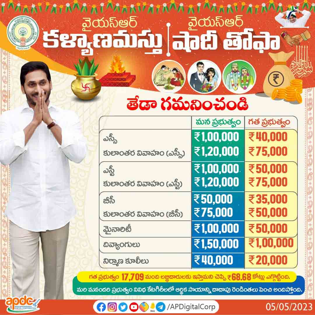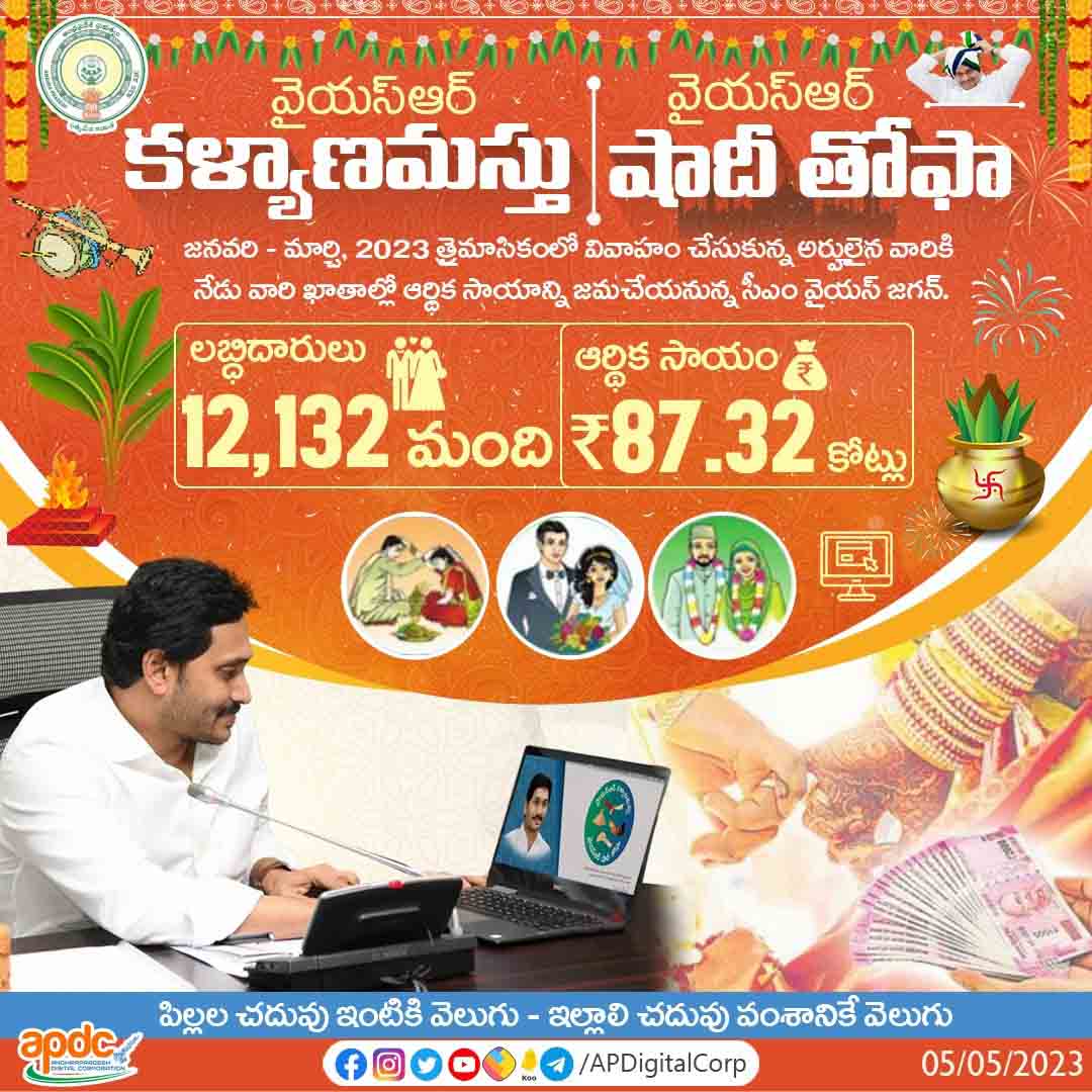 అమరావతి: పేద ఎస్సీ, ఎస్టీ, బీసీ, మైనార్టీ, దివ్యాంగులు, నిర్మాణకార్మికుల కుటుంబాల్లోని ఆడపిల్లల వివాహానికి జగనన్న సాయం.. జనవరి-మార్చి 2023 త్రైమాసికంలో వివాహం చేసుకున్న అర్హులైన 12,132 మంది లబ్ధిదారులకు వైయస్ఆర్ కళ్యాణమస్తు – వైయస్ఆర్ షాదీ తోఫా కింద ₹87.32కోట్ల ఆర్థిక సాయాన్ని నేడు జమ చేయనున్న సీఎం శ్రీ వైయస్ జగన్.