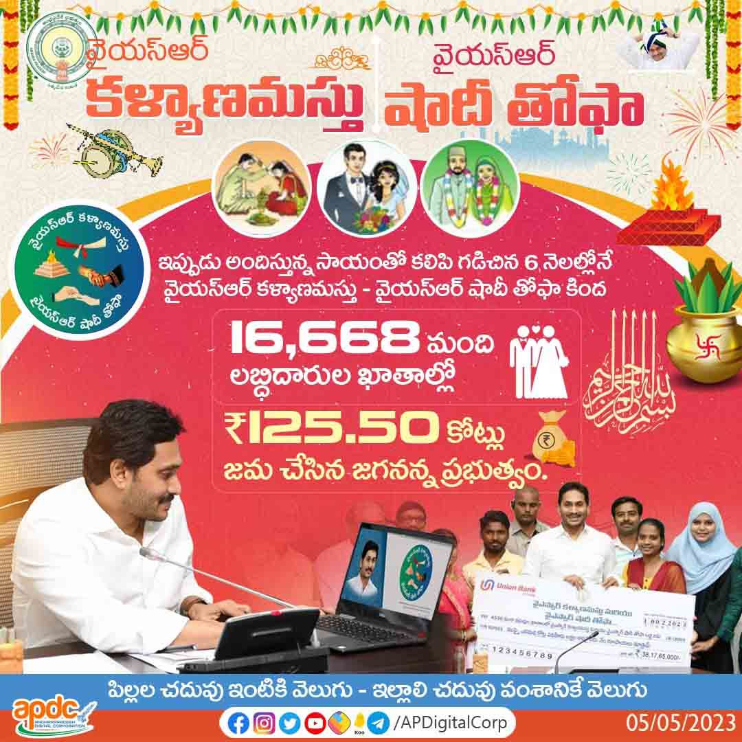 The Jagananna government has deposited ₹125.50 crore in the accounts of 16,668 beneficiaries under YSR Kalyanamastu – YSR Shadi Tofa in the last 6 months along with the assistance provided now.